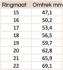 Onze handgemaakte ringen zijn te verkrijgen in maat 16, 17 en 18. Mocht je opzoek zijn naar een grotere of kleinere maat of misschien een tussen maat? Dan is de one size ring een geschikte keuze. Wij bieden one size S aan voor de maten 15, 16, 17 en 18 en one size L voor de maten 19, 20, 21, 22.